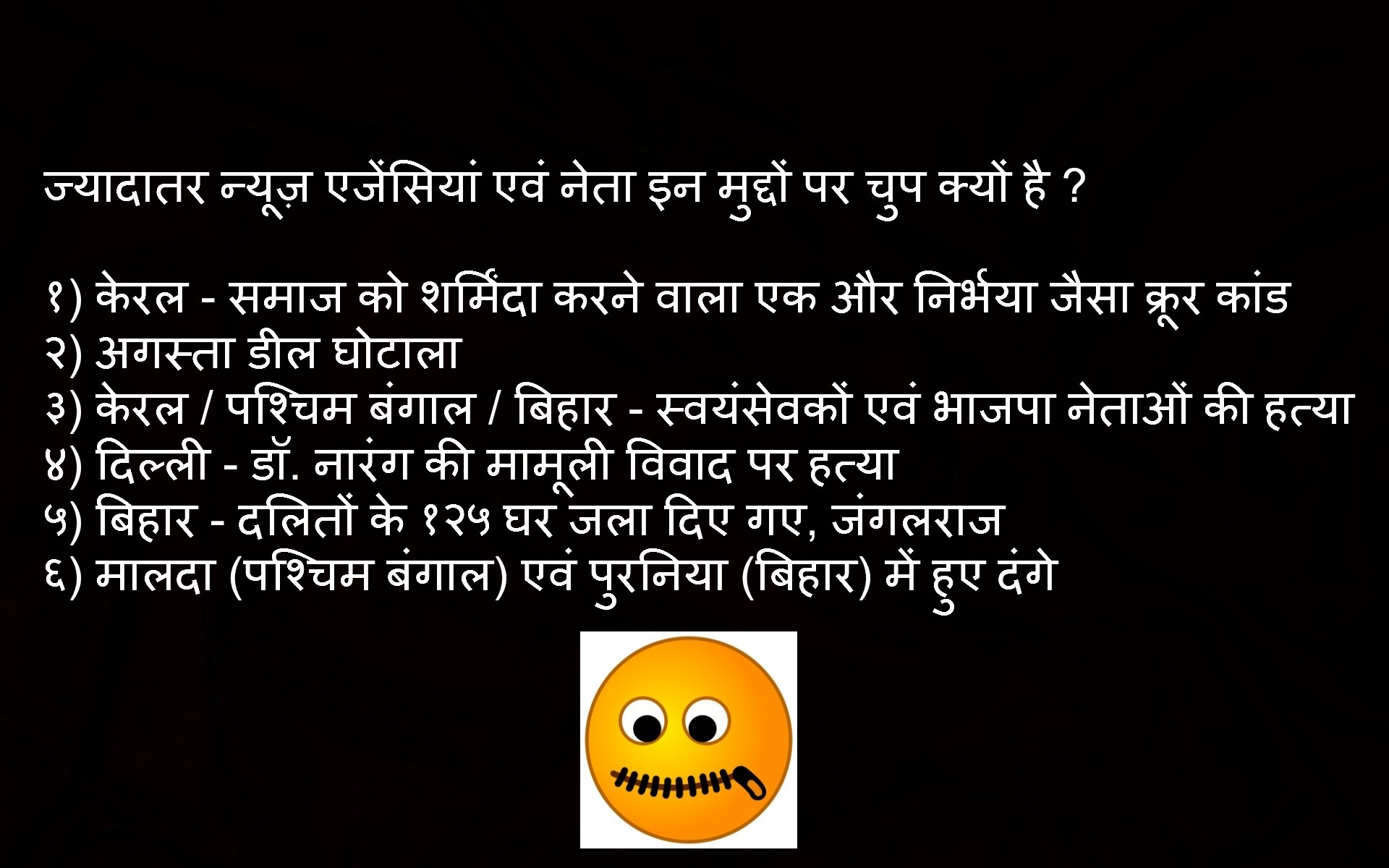 ३) बिहार में भाजपा नेताओं की हत्या और केरल एवं पश्चिम बंगाल में स्वयंसेवकों एवं भाजपा नेताओं की हत्या पर भी ज्यादातर न्यूज़ एजेंसियां एवं पत्रकार चुप हैं | शायद इनकी नजर में भाजपा नेताओं एवं संघ के सदस्यों की हत्या करना अपराध ही नहीं है |