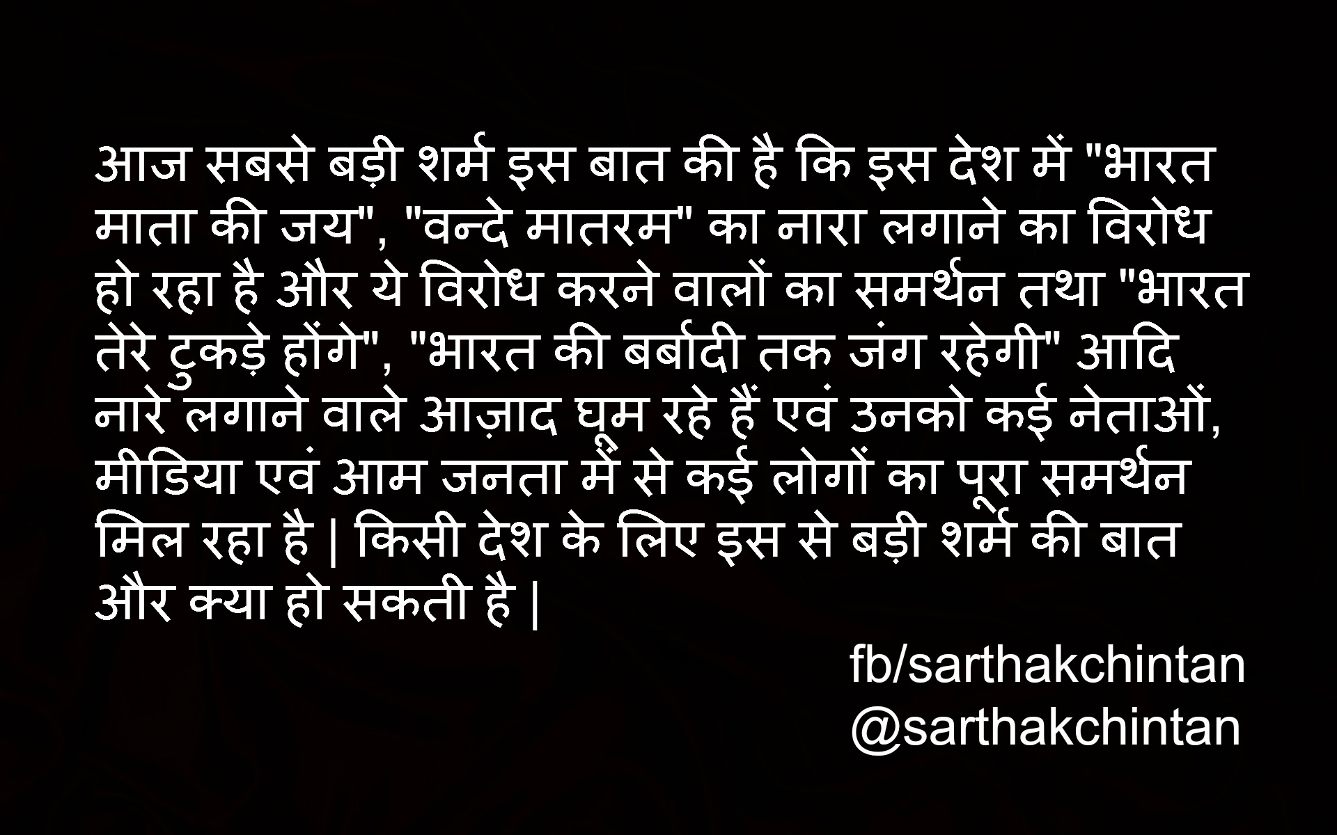 आज सबसे बड़ी शर्म इस बात की है कि इस देश में “भारत माता की जय”, “वन्दे मातरम” का नारा लगाने का विरोध हो रहा है और ये विरोध करने वालों का समर्थन तथा “भारत तेरे टुकड़े होंगे”, “भारत की बर्बादी तक जंग रहेगी” आदि नारे लगाने वाले आज़ाद घूम रहे हैं एवं उनको कई नेताओं, मीडिया एवं आम जनता में से कई लोगों का पूरा समर्थन मिल रहा है | किसी देश के लिए इस से बड़ी शर्म की बात और क्या हो सकती है |